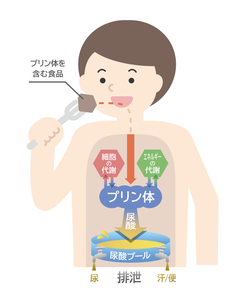 体内の細胞や食品に含まれるプリン体は、肝臓で分解され、尿酸という老廃物になります。その尿酸のバランスが崩れると高尿酸血症になります。体内では1日約700mgの尿酸が作られ、ほぼ同じ量が尿や便として排出されています。健康な成人であれば、常に約1200mgもの尿酸が体内に蓄積されており、この体内に溜まった尿酸を「尿酸プール」といいます。尿酸値は、尿酸を作る量と排出する量のバランスによって保たれているため、作る量が増えたり、出す量が減ったりするとそのバランスが崩れ、尿酸値が7.0mg/dLを超えた状態である高尿酸血症になり、痛風のリスクが高まります。