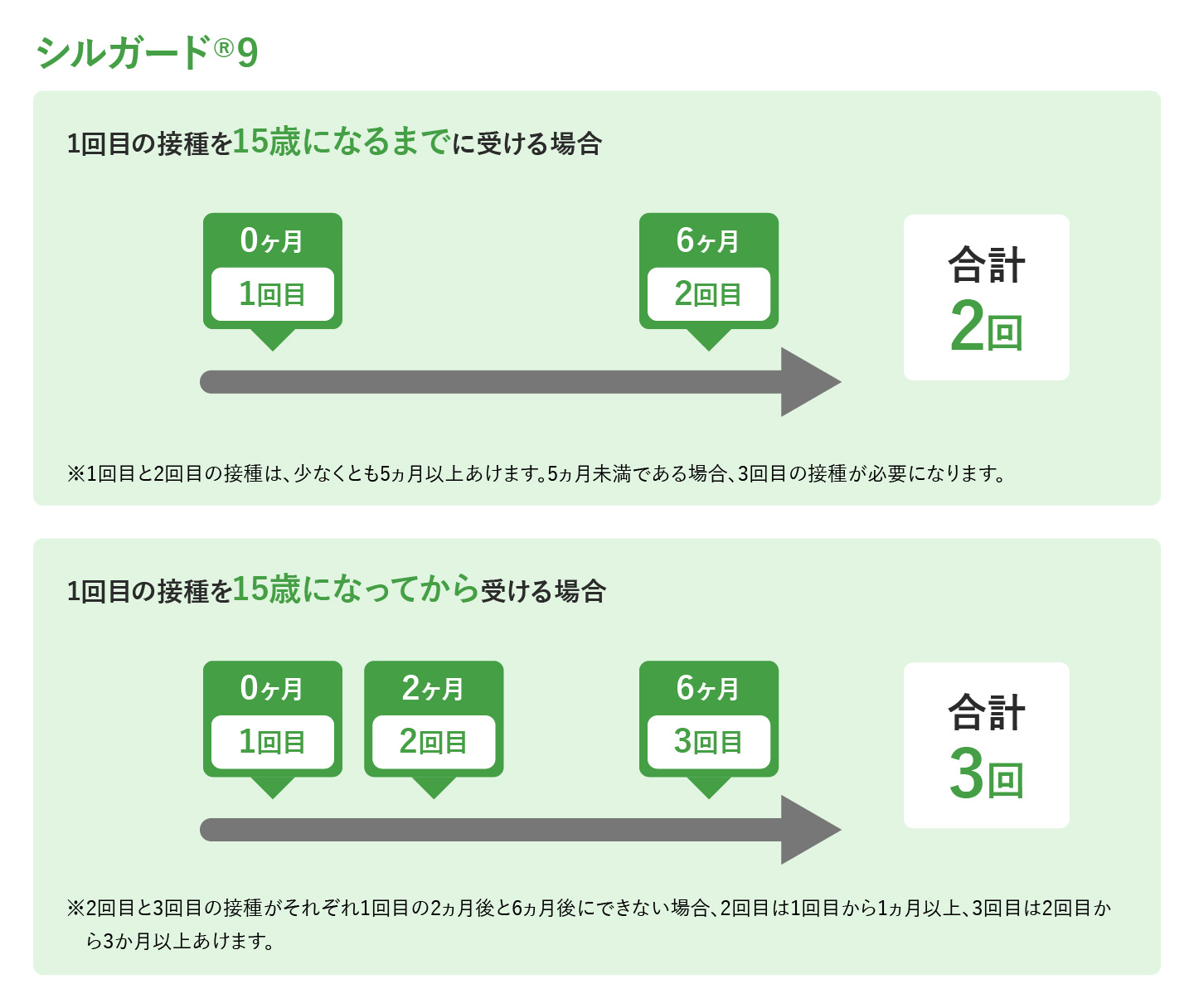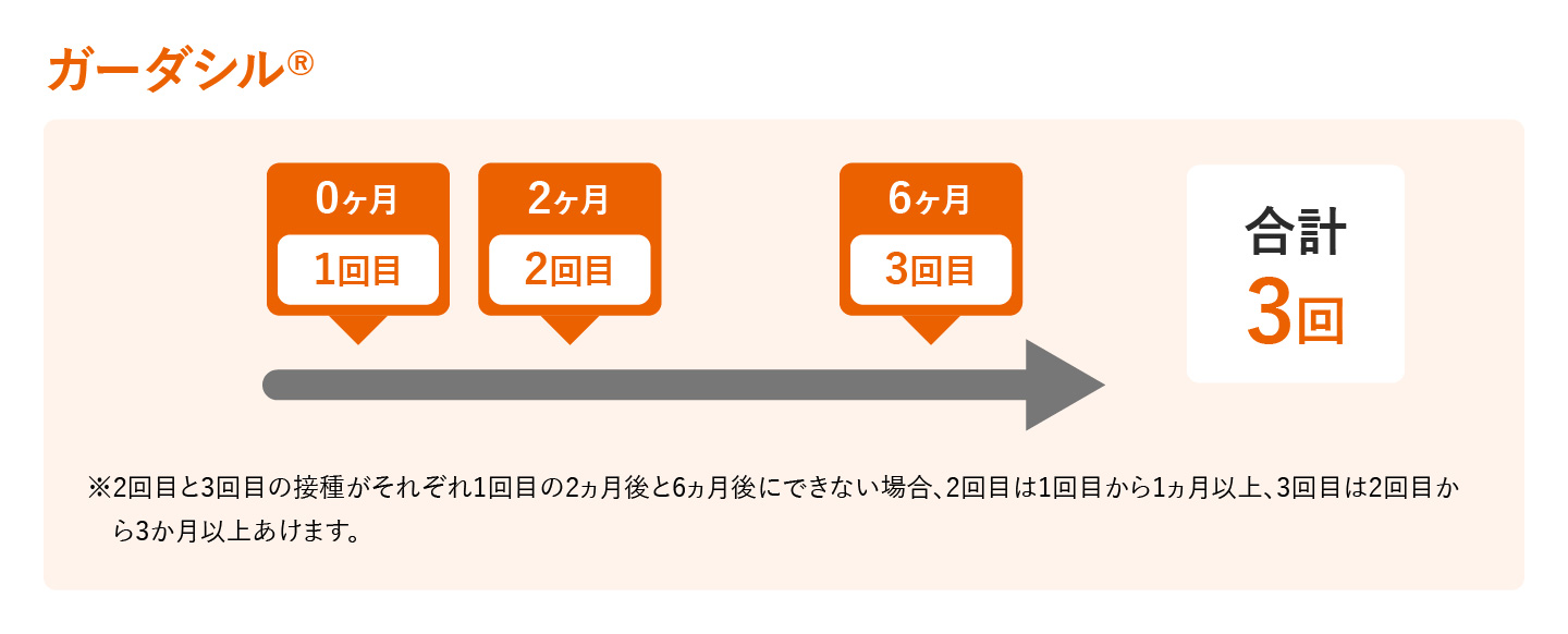 接種スケジュールは1回目の接種を受けるときの年齢によって異なり、合計2回もしくは3回接種します。15歳になるまでに1回目の接種を受けた場合は、5ヶ月以上をあけて2回目を受けることで完了します。1回目の接種を15歳になってから受ける場合は、2回目を1か月以上、2回目接種から3ヶ月以上あけて3回目を受けることで完了します。