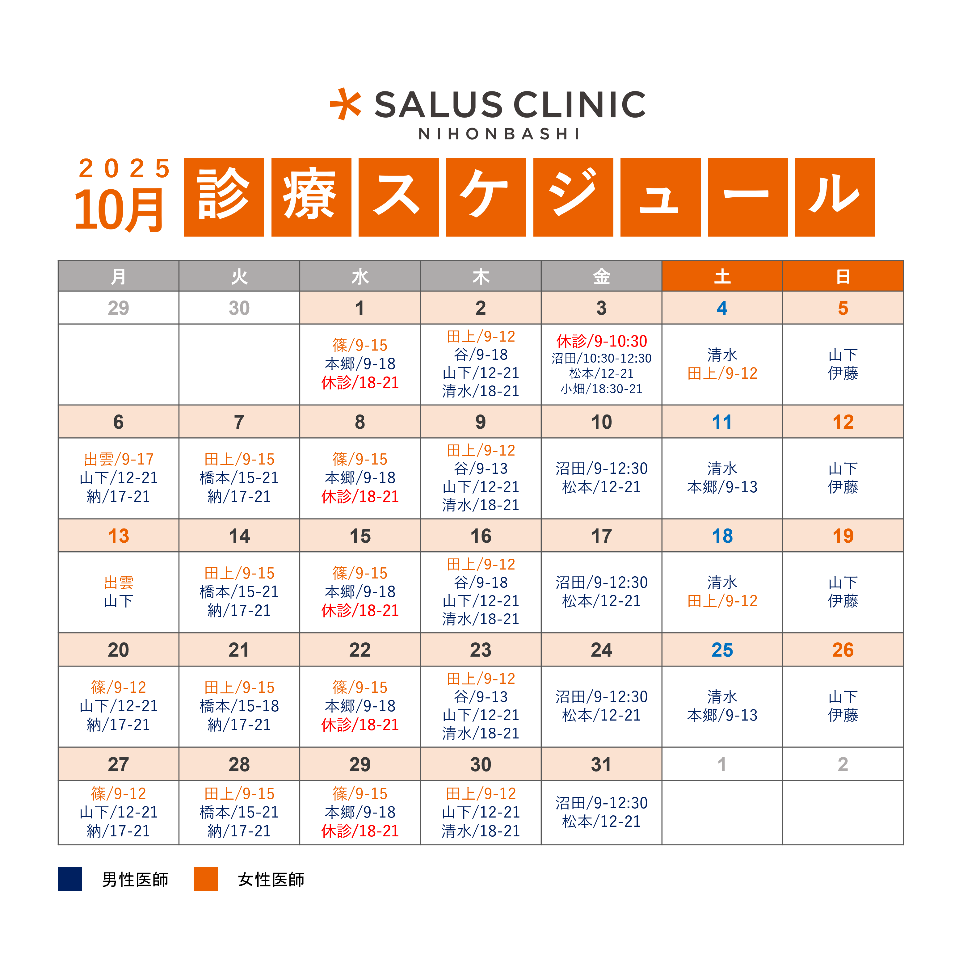 サルスクリニック日本橋の2025年10月の休診日時をお知らせいたします。