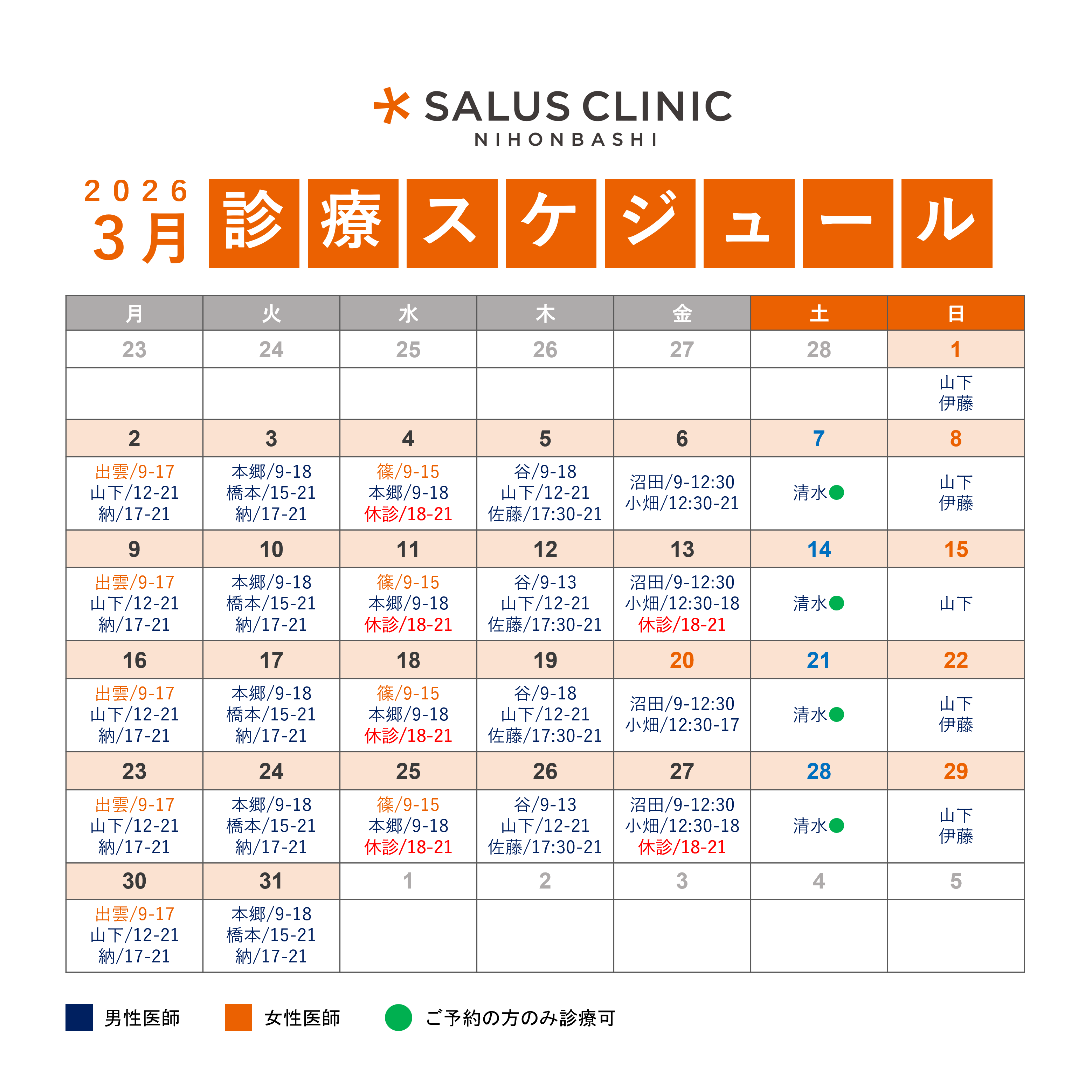 サルスクリニック日本橋の2026年3月の休診日時をお知らせいたします。